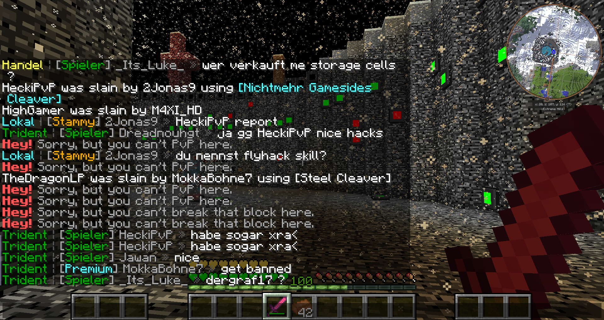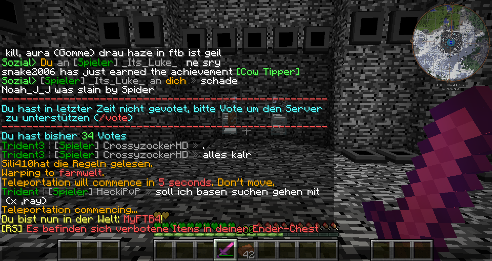 Hier sagte er das er XRay Benutzt. Zuweiterem Haben Mehrere Personen gesehen wie er in der Farmwelt umher Geflogen ist. Zudem denke ich das der Item Verdopplung betreibt darum bitte ich das man 1 mal sein inventar und seine base durchsucht.